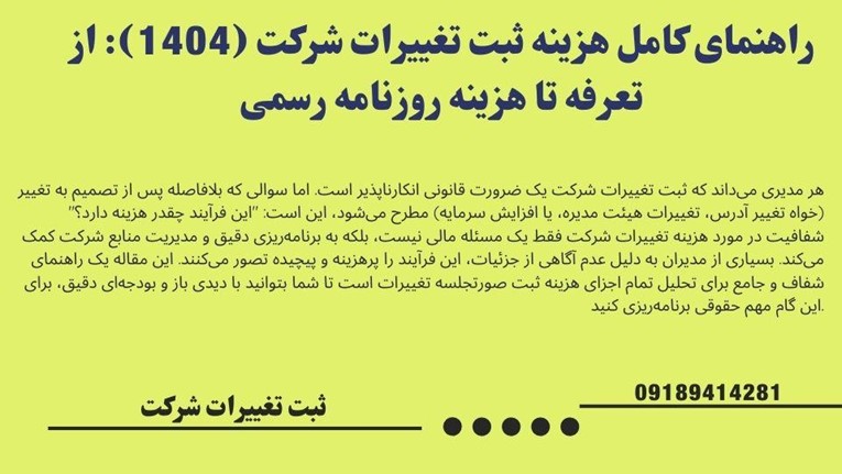 این بخش، اصلیترین و متغیرترین جزء هزینههاست. پس از تأیید نهایی تغییرات توسط اداره ثبت، شما موظف به ثبت آگهی تغییرات شرکت در روزنامه رسمی جمهوری اسلامی ایران هستید.